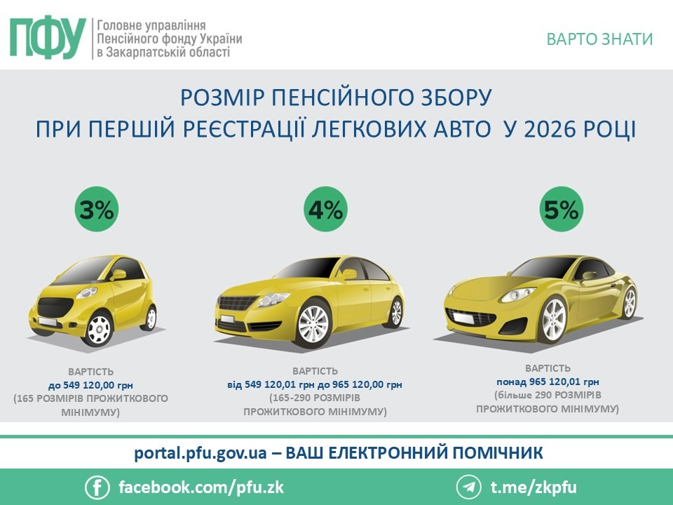 ☝️ Із 1 січня 2026 року змінився розмір вартості суми збору на обов’язкове державне пенсійне страхування при першій державній реєстрації легкового автомобіля в Україні.