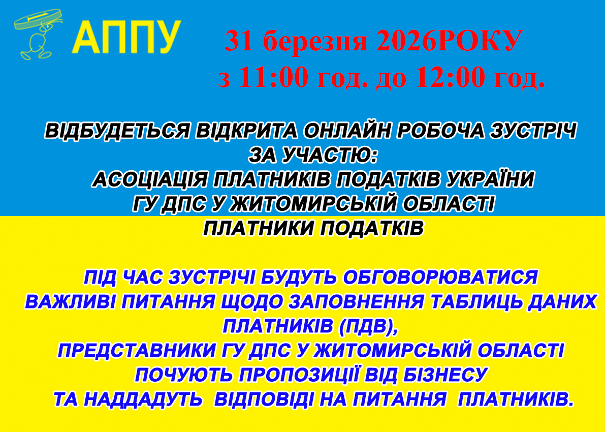 Під час зустрічі будуть обговорюватися важливі питання щодо правильності заповнення Таблиць даних платників (ПДВ), представники ГУ ДПС у Житомирській області наддадуть відповіді на питання платників – учасників заходу.
