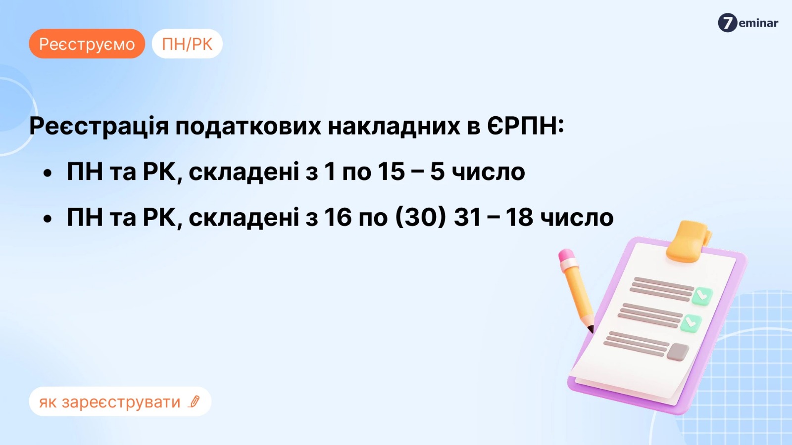 Граничними днями для реєстрації ПН та РК за першу та другу половину жовтня 2025 року будуть 5 (середа) та 18 листопада (вівторок). У ці дні реєструйте ПН / РК протягом усього дня.