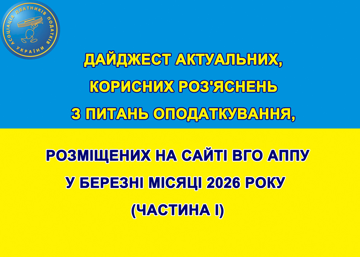 01.04.202606:08Дайджест актуальних, корисних роз’яснень з питань оподаткування, розміщених на сайті ВГО АППУ в березні місяці 2026 року (частина ІІ) 01.04.202606:06Дайджест актуальних, корисних роз’яснень з питань оподаткування, розміщених на сайті ВГО АППУ в березні місяці 2026 року (частина ІІІ) 01.04.202606:04Дайджест відеозаписів актуальних, корисних виступів досвідчених лекторів – податківців та партнерів ВГО АППУ на онлайн Вебінарах Асоціації, проведених в березні місяці 2026 року. 01.04.202606:02Дайджест «Відкритих Співрозмов Віце-президента, Генерального директора Людмили Герасименко з поважними, цікавими співрозмовниками, проведених в березні 2026 року. 01.04.202606:00Дайджест відеопромов Віце-президента, Генерального директора ВГО АППУ Людмили Герасименко під час проведення освітньо-просвітницьких заходів в березні місяці 2026 року ВСІ НОВИНИ