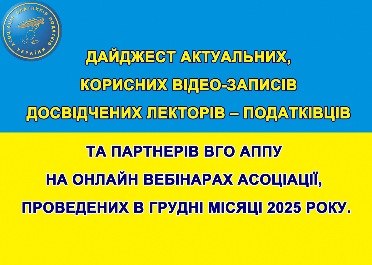 Дайджест відеозаписів актуальних, корисних виступів досвідчених лекторів – податківців та партнерів ВГО АППУ на онлайн Вебінарах Асоціації, проведених в грудні місяці 2025 року.