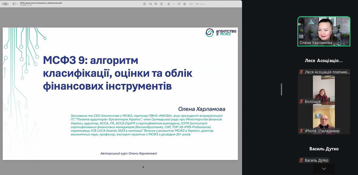 14 січня 2026 року Генеральна дирекція ВГО АППУ провела 1-й в цьому році спільний онлайн Вебінар за участю надійного партнера нашої потужної Асоціації, високопрофесійного лектора Олени Харламової — Голови компанії Агентство з МСФЗ; доктора економічних наук, професора за темою: «МСФЗ 9: алгоритм класифікації, оцінки та облік фінансових інструментів».