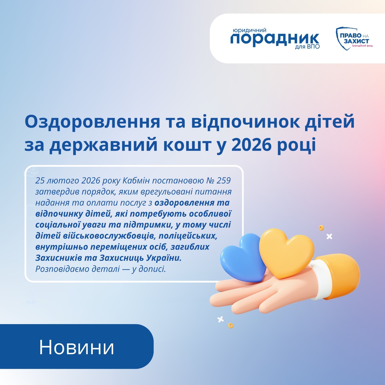 Кожна дитина має право ✔на відпочинок та ✔оздоровлення. 25 лютого 2026 року Кабмін постановою № 259 затвердив порядок, яким врегульовані питання надання та оплати послуг з оздоровлення та відпочинку дітей, які потребують особливої соціальної уваги та підтримки, у тому числі дітей військовослужбовців, поліцейських, внутрішньо переміщених осіб, загиблих Захисників та Захисниць України (далі — Порядок).