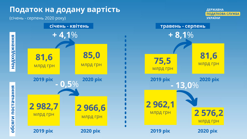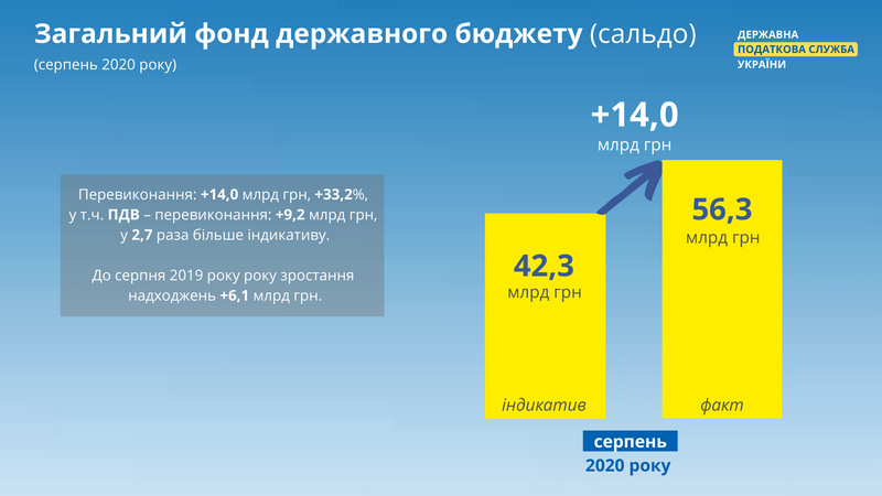 У серпні 2020 року до загального фонду державного бюджету надійшло 56,3 млрд грн. Це на 14,0 млрд грн, або на 33,2 % перевищує очікувані надходження, та на 6,1 млрд грн більше надходжень серпня 2019 року. До бюджету додатково надійшло 9,2 млрд грн. Порівняно з серпнем минулого року сума надходжень ПДВ збільшилась в 1,7 раза.