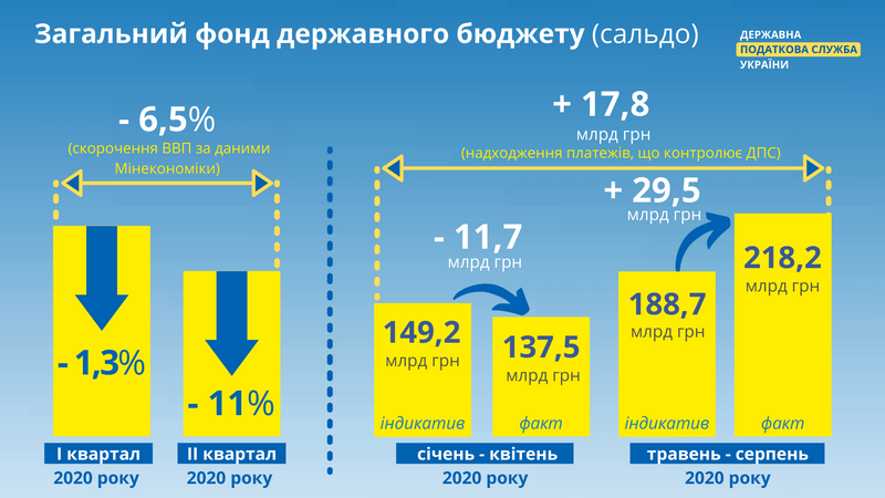У серпні 2020 року до загального фонду державного бюджету надійшло 56,3 млрд грн. Це на 14,0 млрд грн, або на 33,2 % перевищує очікувані надходження, та на 6,1 млрд грн більше надходжень серпня 2019 року. До бюджету додатково надійшло 9,2 млрд грн. Порівняно з серпнем минулого року сума надходжень ПДВ збільшилась в 1,7 раза.