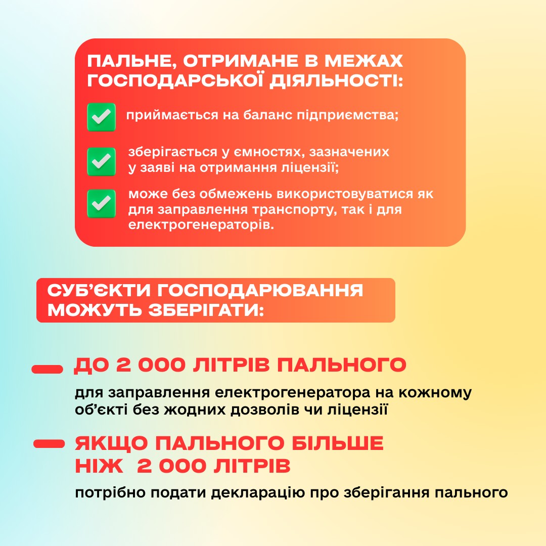 Нагадаємо: субʼєкти господарювання можуть зберігати до 2 000 літрів пального для заправлення електрогенератора на кожному об’єкті без жодних дозволів чи ліцензії.