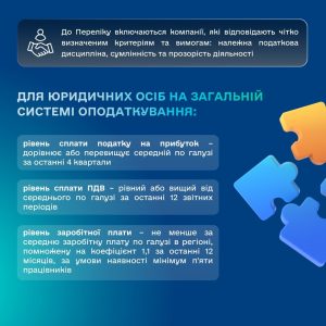 До Переліку включаються компанії, які відповідають чітко визначеним критеріям та вимогам: належна податкова дисципліна, сумлінність та прозорість діяльності.