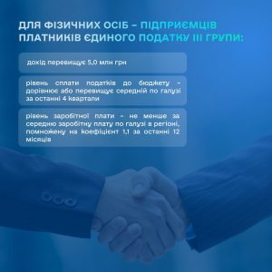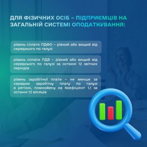 — рівень заробітної плати – не менший за середню заробітну плату по галузі в регіоні, помножену на коефіцієнт 1,1 за останні 12 місяців, за умови наявності мінімум п’яти працівників,
