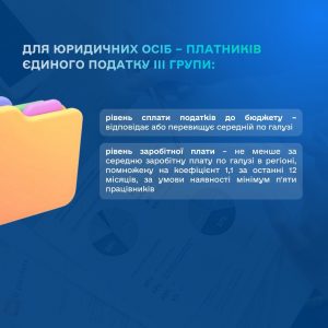— рівень заробітної плати – не менший за середню заробітну плату по галузі в регіоні, помножену на коефіцієнт 1,1 за останні 12 місяців, за умови наявності мінімум п’яти працівників,