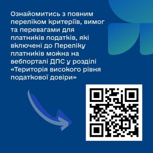 Ознайомитись з повним переліком критеріїв, вимог та перевагами для платників податків, які включені до Переліку платників можна на вебпорталі ДПС у розділі «Територія високого рівня податкової довіри» за посиланням https://tpd.tax.gov.ua/.