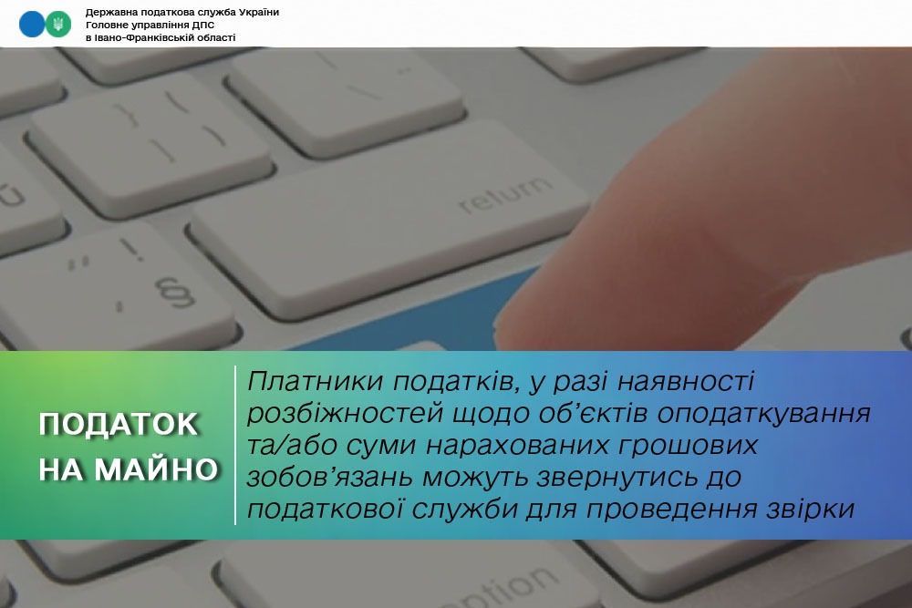 Звертаємо увагу платників податків, що у разі наявності зауважень щодо об’єктів оподаткування та/або суми нарахованих грошових зобов’язань пропонуємо звернутись письмово або в електронній формі засобами електронного зв’язку до контролюючого органу для проведення звірки даних щодо: