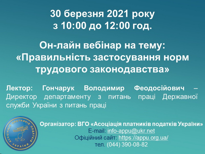 У зв’язку із набранням чинності великої кількості змін, які стосуються питань законодавства про працю, Генеральною дирекцією ВГО АППУ разом з Державною службою України з питань праці буде проведений 30 березня цього року з 10:00 до 12:00 год. он-лайн вебінару в форматі відео-конференції для висвітлення теми: «Правильність застосування норм трудового законодавства».