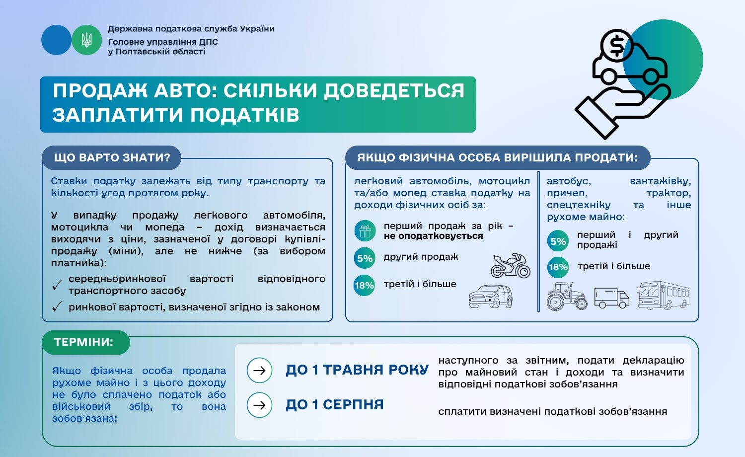 У Головному управлінні ДПС у Полтавській області повідомляють, що громадяни, які вирішили продати власні авто, мають сплатити податки. Ставки податку залежать від типу транспорту та кількості угод протягом року.