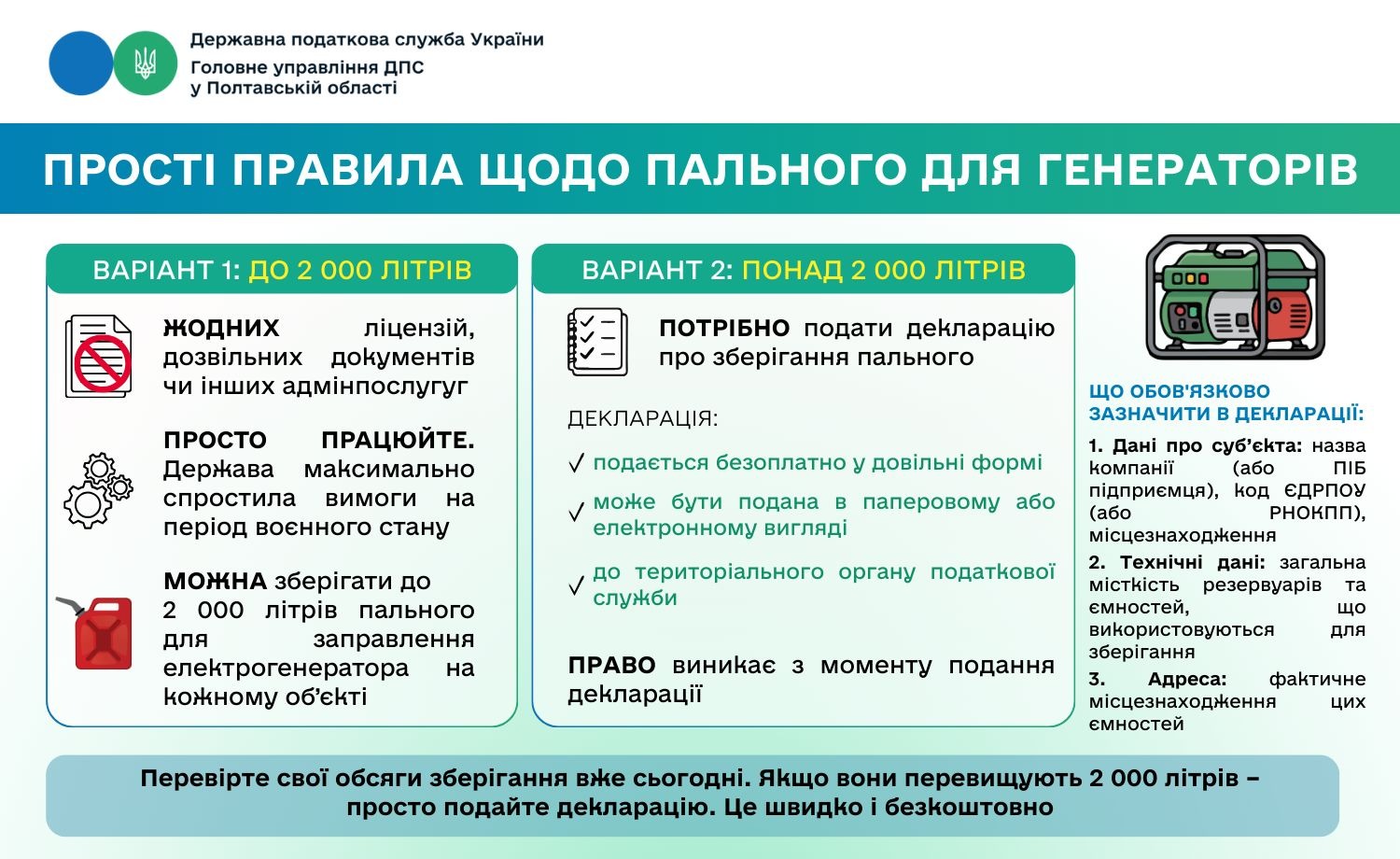 Перевірте свої обсяги зберігання вже сьогодні. Якщо вони перевищують 2 000 літрів – просто подайте декларацію. Це швидко і безкоштовно.