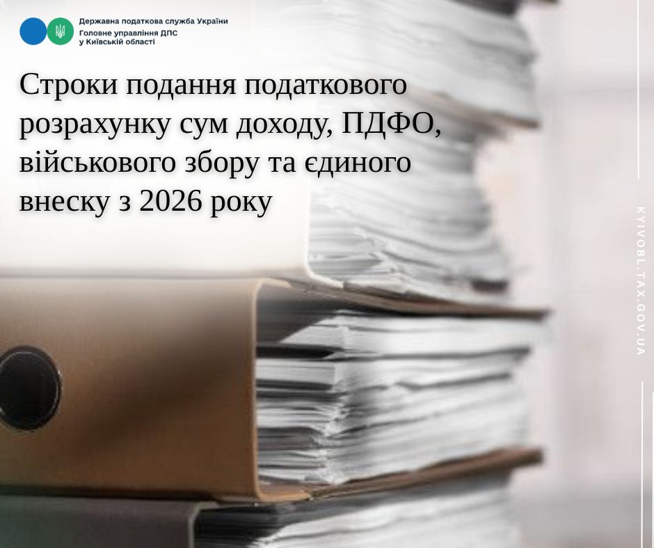 Головне управління ДПС у Київській області повідомляє, що з 1 січня 2026 року набирають чинності зміни до пункту 51.1 статті 51 Податкового кодексу України, якими розмежовано строки подання податкового розрахунку сум доходу, ПДФО, військового збору та єдиного внеску залежно від категорії платника.