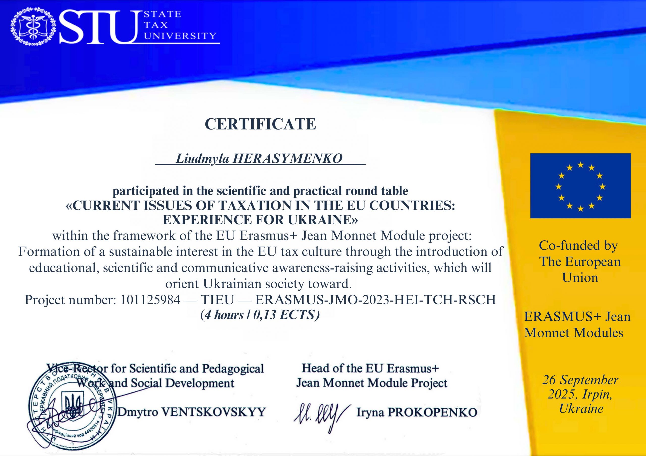 Віце-президент, Генеральний директор ВГО АППУ Людмила Герасименко отримала Сертифікат учасника науково-практичного Круглого столу «Актуальні питання розвитку податкової культури в країнах ЄС: досвід для України».
